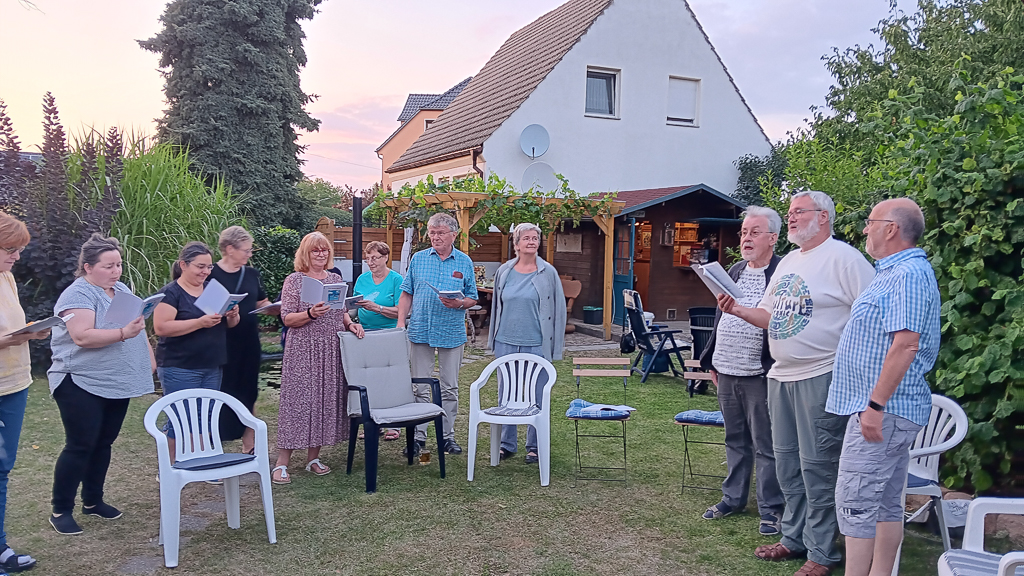 Der ehemalige Vokalkreis Großenhain traf sich zu einem wunderbaren Gartenfest. Es gab viel zu erzählen, leckeres Essen mit frisch geräucherter Forelle. Natürlich wurde auch fröhlich gesungen.